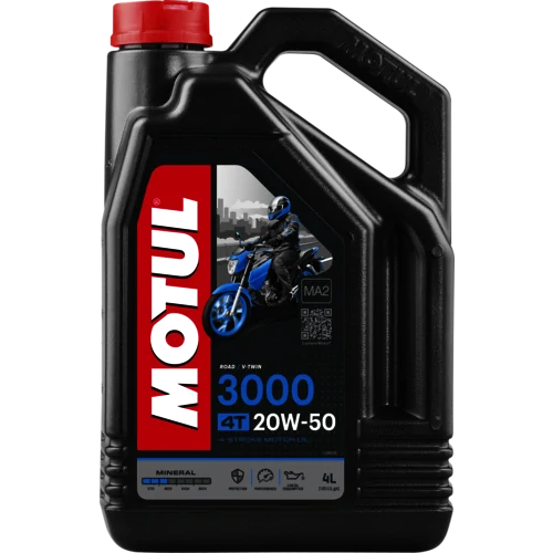 MOTUL 3000 4T 20W-50 je minerálny 4-taktný olej. Chráni motor a prevodovku. Vyhovuje špecifikáciám Harley-Davidson® Vyhovuje špecifikáciam JASO MA2, proti preklzu mokrej spojky. Vhodné aj pre katalyzátory. Schválenie API SG, JASO MA M033MOT059.