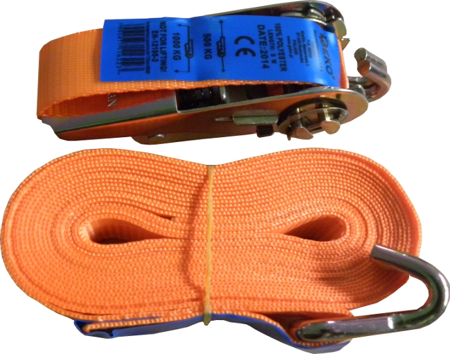 Pás upínací s račňou "kurtna" a s hákmi na oboch koncoch pre uchytenie o celkovej nosnosti 1 ton a dĺžkou 5 m. Pevnosť pásu je 1000 kg pri opásania a 500 kg v ťahu. Šírka ponúkané kurtny je 25mm.